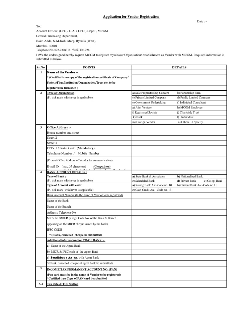 9 Printable Blank Vendor Registration Form Templates For Word Pdf from www.wordtemplatesonline.net Please note the impact if the following data are not updated in vendor master in contact person section. When you receive the alert, you should access the website, to request complete bid documents. Because a customer should not take a load of a vendor registration form field. This request for vendor registration shall have the reference rvr no. To expedite the application process, vendors are. ¾ vendor registration request (for new vendors to get registered within dewa system) ¾ log in into dewa srm portal ¾ go through the enquiries/tenders sent by dewa (for registered vendors only) ¾ online response/bids for the dewa (for registered vendors only). Type or print information neatly. In order to receive notifications about bid opportunities or to be issued purchase orders (pos) through procureaz vendor registration.